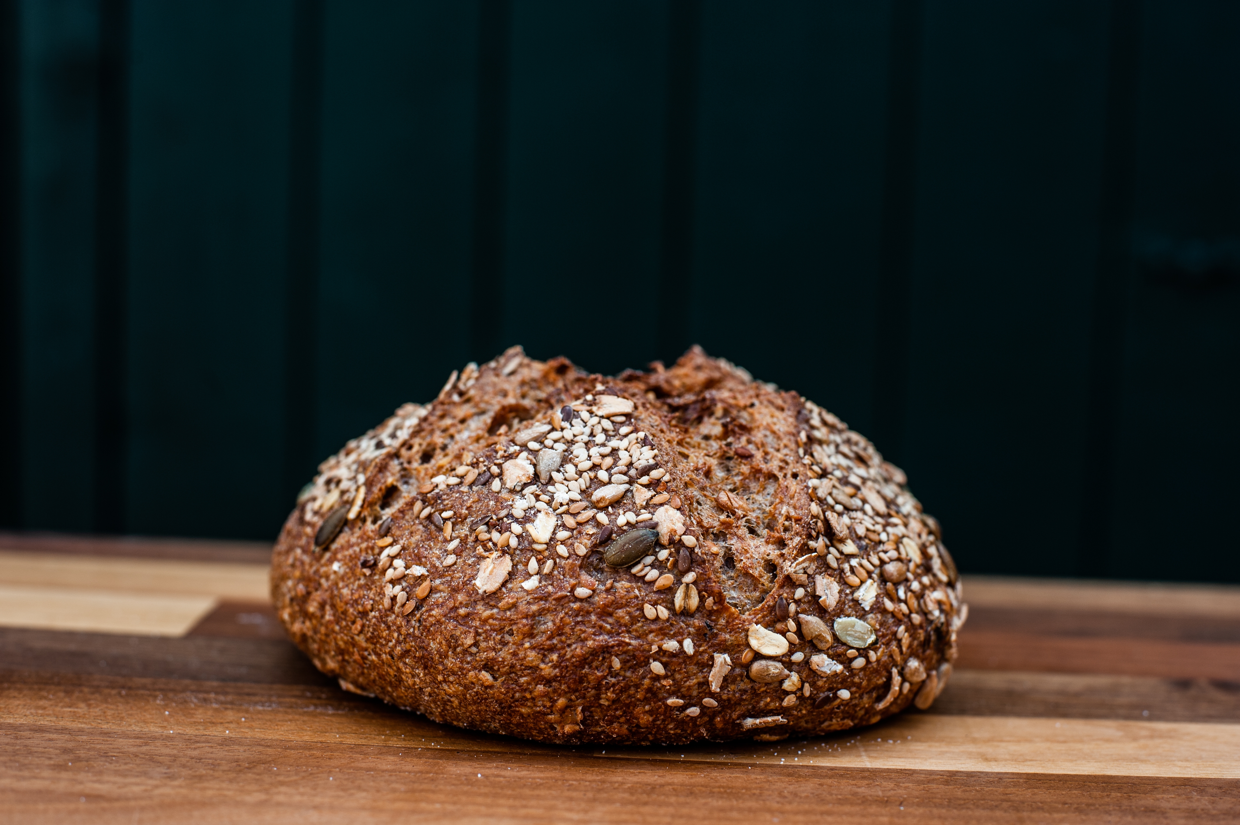 Een spelt volkorenbrood, gevuld met allerlei zaden en graanvlokken.