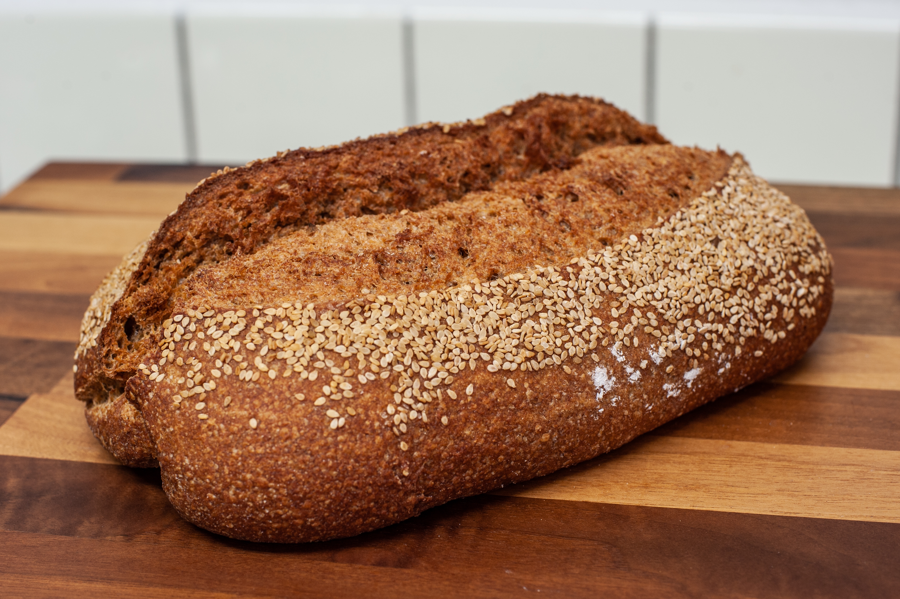 Een wit brood met sesam erop. Hier zijn bijna alle kiemen en vezels uitgezeefd.